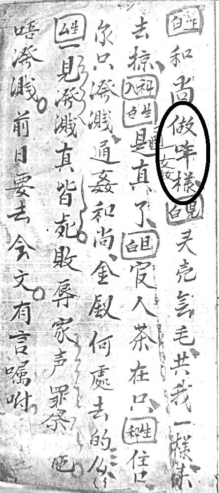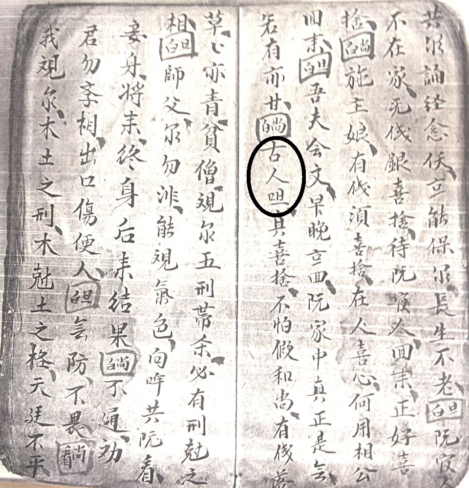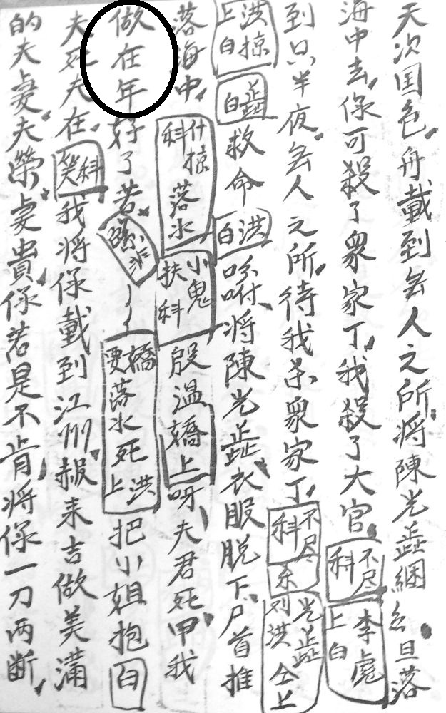 【雲飛】は南曲の【駐雲飛】、【山坡】は南曲の【山坡羊】の、台湾皮影戯における特徴的な言い方である。これらの曲牌の使用は、上四本などの台湾皮影戯の一般的な文戯の演目とも共通している*9。また台本の形態も、齣題・唱詞・科白などが並び、上四本などの台湾皮影戯の一般的な文戯の形式と同じで、潮州語表現が現れる点も共通している。台湾皮影戯における潮州語表現は様々なものがあるが*10、本論では中でも特徴的な「呾(言う)」と「做年(どのように)」が、それぞれの台本に現れるかどうかを見ていくこととしたい。まず、図1は甲本、図2は乙本で潮州語の「呾」が現れる個所である(囲み部分の「古人呾(昔の人は言った)」)。図3は甲本、図4は乙本で潮州語の「做年」の派生形の「做年樣(どうでしょうか)」が現れる個所である(囲み部分)。