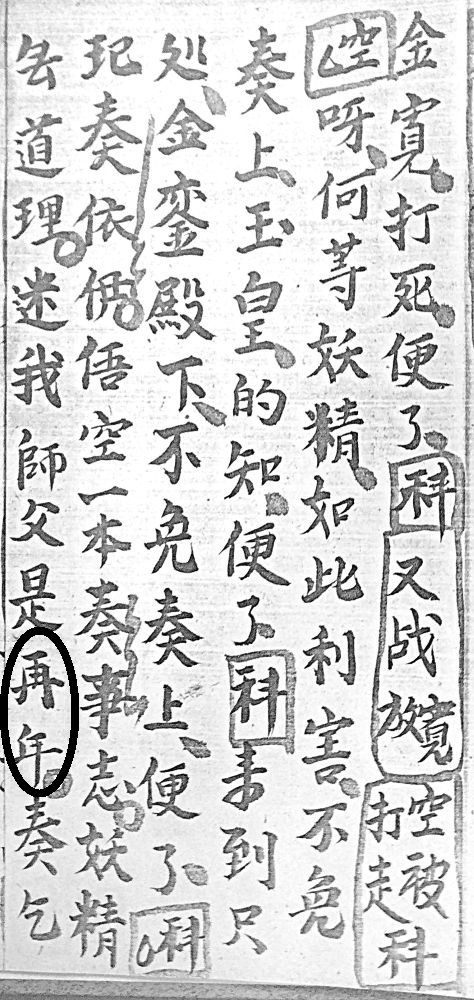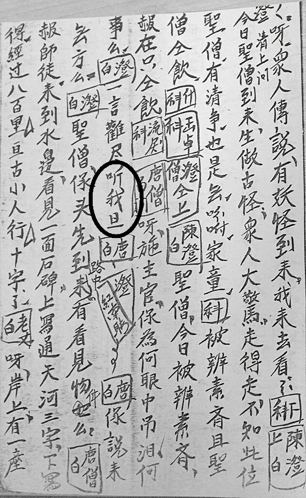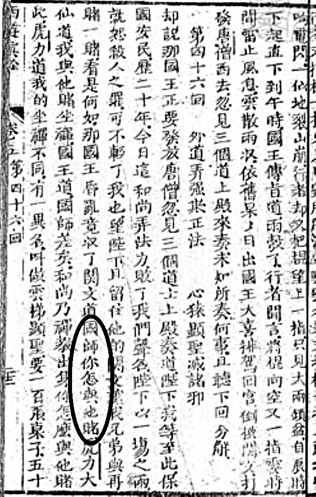 この部分の小説『西遊記』の対応箇所を見ると完全に同文で、『陳光蕊』同様に小説の文章を官話的な表現も含めて引き写していることがわかる(図18、「國師你怎麼以他鬥法(国師よ、どのようにかれと勝負するのだ)」)。齣題が小説の回目になっていることや、小説の内容がほとんど改変されずに収録されていることも考えると、この台本も小説を直接参照して作られたと思われる。