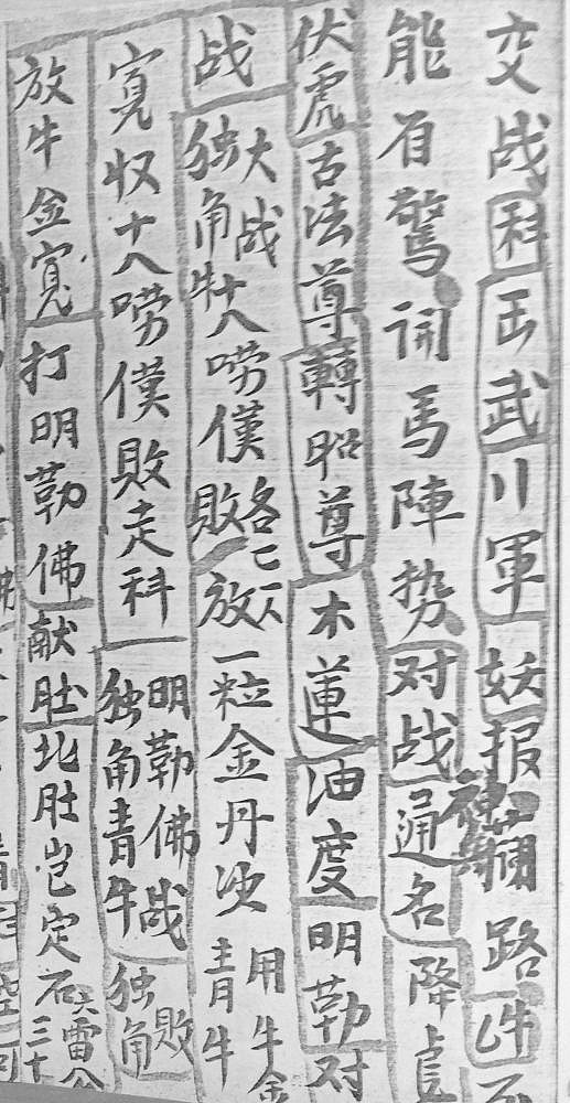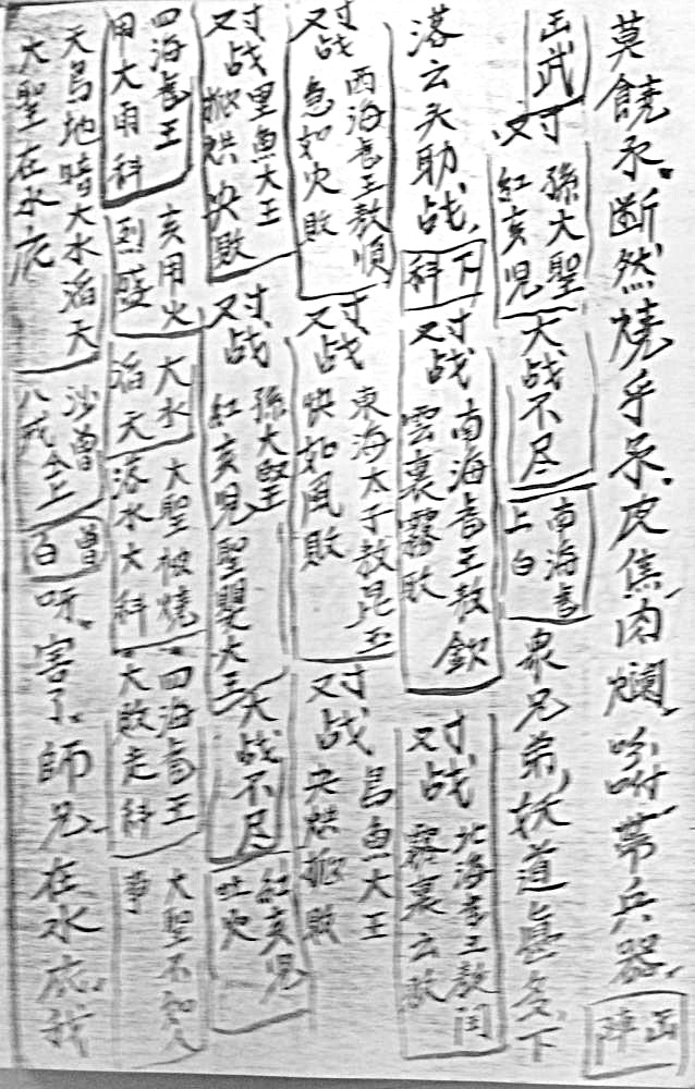 また、前章で扱った『劉全進瓜』『陳光蕊』は文戯に相当する演目であったが、一方でこの『西天取経』は立ち回りの場面が非常に多い。図12の囲み部分の中央に見える、四角で囲った「空鹿大战」という文字は、「孫悟空と鹿精が大いに戦う」ということだが、人物の具体的な動きはこれだけでは分からない。こうした個所は、芸人たちが人形同士を戦わせる操作のノウハウが別にあり、それを当てはめることで上演を行ったものと思われる。