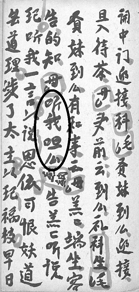 潮州語表現は「呾」、「做年」ともに出現する。図22は「听我呾(私が話すのを聞きなさい)」で、図23は「做年」の派生形の「做再年(どのように)」である。