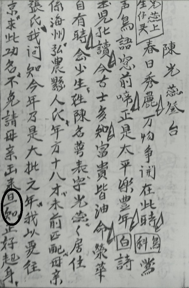 台本は、『劉全進瓜』同様、齣題・唱詞・科白などが並び、またやはり「呾」のような潮州語表現が現れる。図5は「旦」と記しているが、「呾」から派生した「呾知(話して知らせる、告げる)」である(囲み部分)。