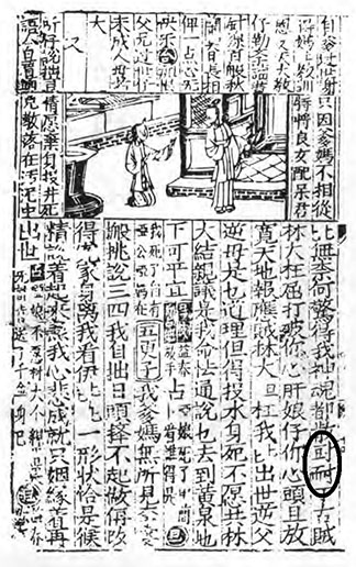(公科云)赧是何處來的?(丑云)京師來的。[(公、仕草をして言う)君たちはどこからきだのだ。(丑言う)都から来ました。]《蔡伯皆・張公掃墓》第40葉