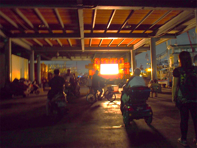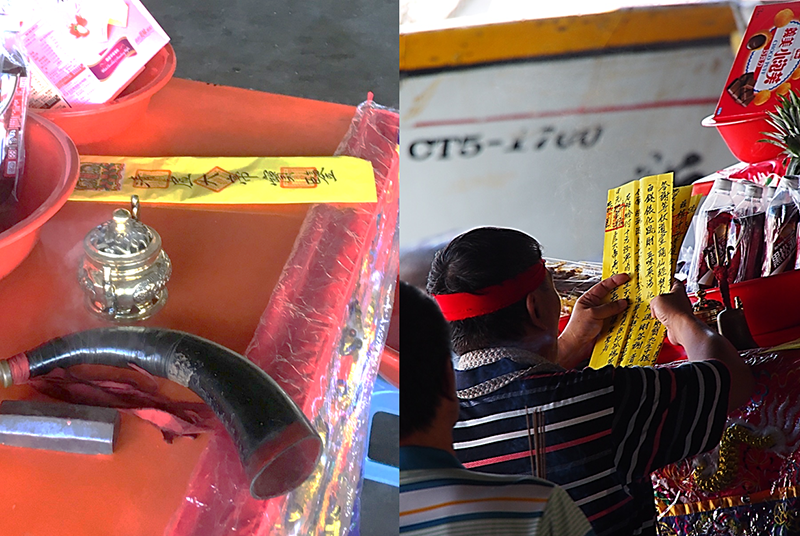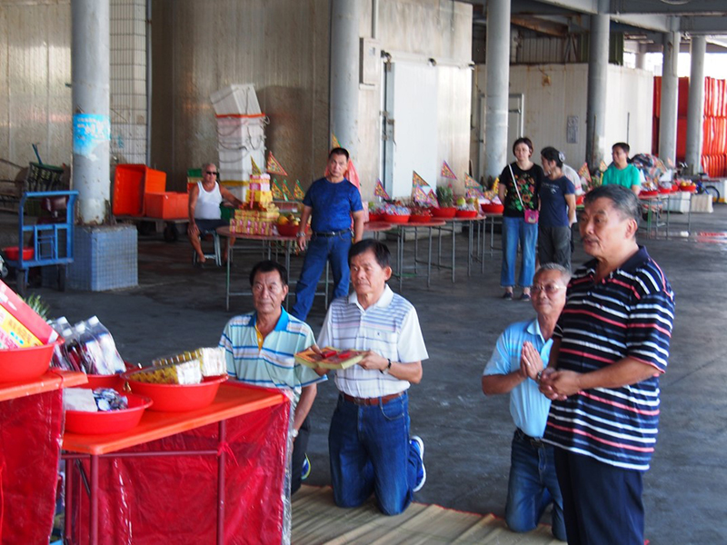 全体の流れはやはり9月5日・6日と変わらないが、爆竹や紙銭焼却をその場で行わなかったのは、市場だということもあり、政府の規制が関係しているのだろう。この日は、前日には解らなかった「道士」の儀礼を細かく観察することができ、1回目の拝礼で『清虚大帝宝鑑』を読み上げ、これを2回目の拝礼に入る前に焼却していることが解った。また3回の拝礼の後にはポエ(貝殻を模した2つの木片を投げて行う占卜の一種)が行われ、一度で聖筊(一方が表、一方が裏となり、神の同意を得たこと)が出た際には、参列者から歓声が上がった。後で漁会の幹事の方に感想を伺ったところ、「以前布袋戯を行った時にはなかなか聖筊が出なかったこともあったが、やはり皮影戯は違う」という話が返ってきた。