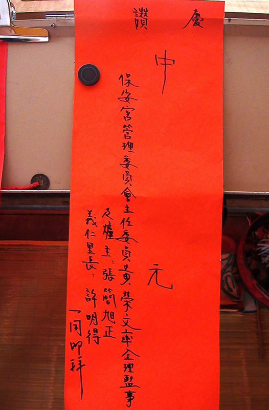 主:多蒙七月中元,二品赦罪地官清虛大帝聖誕,萬壽無疆。中元普渡公男女好兄弟聖誕千秋,來保庇××一同,闔家平安,年年大賺錢。