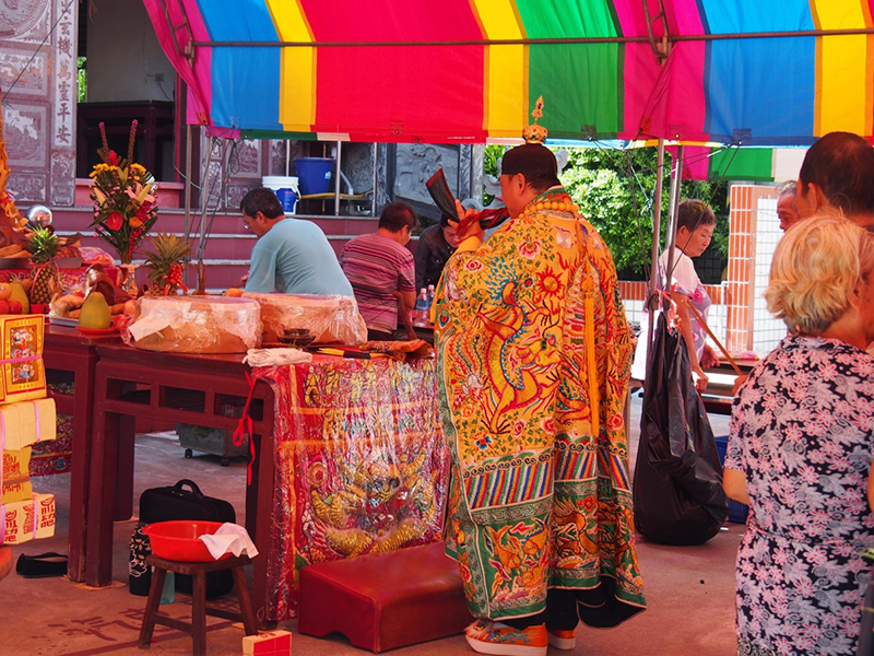 おおまかな流れは前日の赤崁保安宮とほとんど同じだが、今回は廟側に「道士」がいた点が大きく異なっている。ただ、関係者はいずれも「道士」と呼んでいたが、13:30からの儀礼で浄鞭を用いて清めを行ったり、14:00からの拝礼で牛角を吹いたりしていたため、これらの要素を考えると、道教に属する道士ではなく、いわゆる「法師」の類だと思われる。この「道士」は、儀礼のほかに参列者の拝礼の音頭取りも行っていたが、これは赤崁保安宮では廟の管理委員会の方が担当していたものである。
