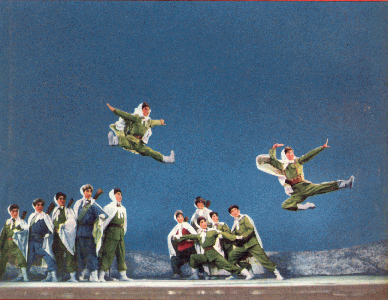 京舞体三結合とは、伝統的な京劇の演技術に、「舞」つまりバレエを主軸とした当時の舞踊、および「体」すなわち器械体操を中心とした各種スポーツを加え、この三つを身体技法の基礎とする、という意味である。たとえば写真1は『智取威虎山』の一シーンだが、跳躍動作を見せている俳優達の演技から、そこにバレエや体操の影響があったことは容易に見て取れるだろう。