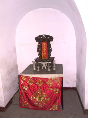 また解放前は、碗碗腔皮影戯芸人の職業神、いわゆる「祖師爺」として、「苗荘王」が祀られたという。現在、博物館の敷地内に移築されている旧時の皮影戯戯台でも、後台に苗荘王を祀った霊牌が供えられている (写真参照)。なお皮腔皮影戯の祖師爺は黄竜真人、木偶戯は陳平、人戯である梆子戯は老郎神(一般に唐の玄宗とされる)であるとされる。苗荘王については、博物館の展示室内にある解説文「碗碗腔皮影戯祖師爺苗荘王」では以下の様になっている。