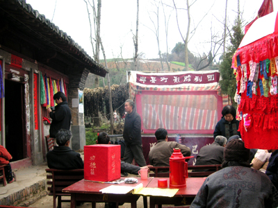 西安の西北、咸陽市礼泉県は、陝西西路皮影戯の代表的声腔である弦板腔の発祥地である。弦板腔が形成されたのは清末民初であるが、解放後に上演・演唱方式などが改革されている。調査地は、同県五都村。