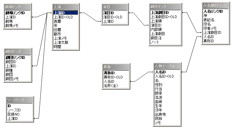 そこで、京劇上演データベースの構築には、リレーショナルデータベース(RDB)を採用した。RDBとは、複数のテーブルを関連づけることで、柔軟なデータベース構造を実現するものである。技術的には既に枯れたものであるといえよう。現在構築中のプロトタイプには、Microsoft Access 2003を利用している。将来的には、PostgreSQLなどを利用して、オンラインデータベース化する計画である。