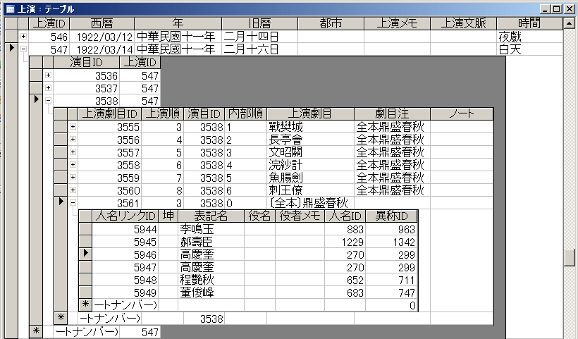 このため、京劇上演資料のデータベース化にあたっては、一日の上演活動全般と、上演劇目に加えて、中間的なユニットの概念が必要になる。本DBではそれを仮に「演目」と名付け、上演・劇目と合わせて三種のテーブルを作成した。演目テーブルの実体は、上演テーブルのIDと上演テーブルのIDとを一対多の関係で関連づけるためのもので、文字データは含まれない。図は、上演テーブルから、関連する演目・劇目・役者のデータを表示させたところである。
